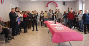 Les élèves de maternelle les ont rejoints pour un ‘ au revoir ‘ à Pascale Dibling, enseignante et à Nicole Sohier, ATSEM.
